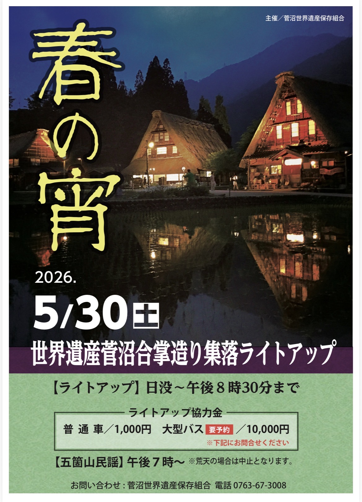 新緑の季節、世界遺産・菅沼合掌造り集落を美しく照らし出すライトアップイベント**「春の宵」**を開催いたします 。 幻想的な夜景とともに、伝統ある五箇山民謡の調べをお楽しみください 。
